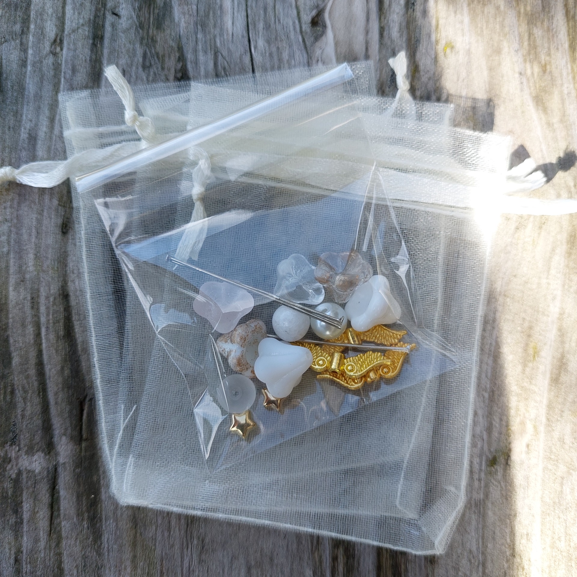 Inside the package, you’ll find beautifully coordinated Czech glass beads with hand-gilded details in white, matte, and crystal tones, a metal head pin, golden wings with a star topper, and organza gift bags. For finishing, we recommend using round-nose pliers.