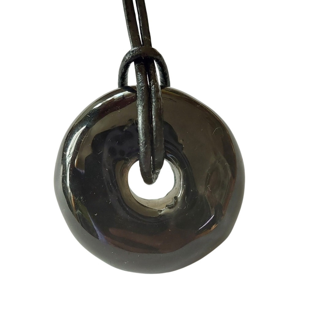 An elegant and minimalist ceramic pendant in the shape of a glossy black rondelle, suspended on a leather cord. Its simple design makes it perfect for everyday wear or as a subtle accessory to complement any outfit.