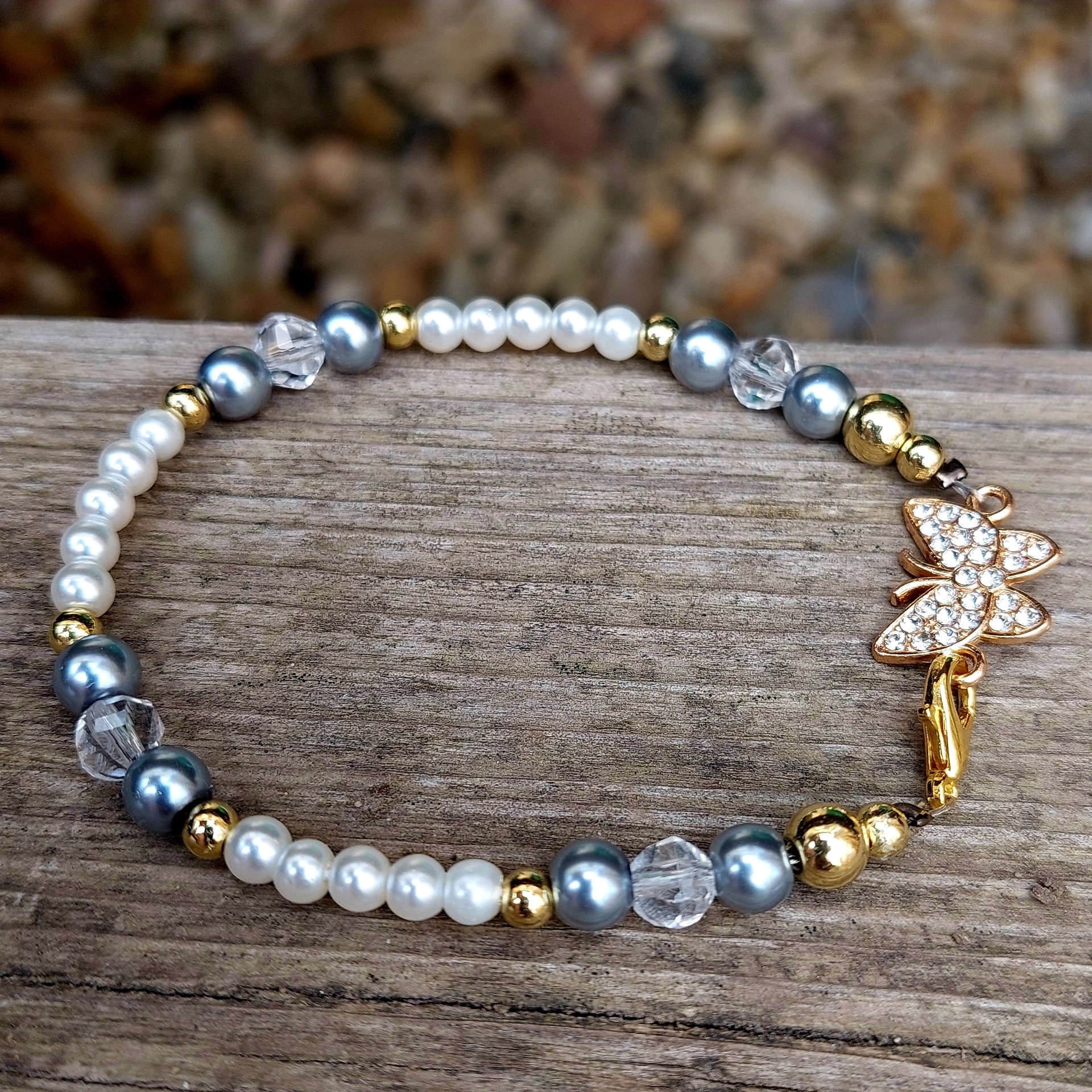 Dominantou šperku je zlatý motýlek zdobený drobnými šatonovými kamínky (krystaly), které se při každém pohybu jemně třpytí a dodávají náramku sofistikovaný vzhled. Náramek je vytvořen z bílých a šedých voskovaných perliček o velikosti 4 mm a 6 mm, doplněných zlatými kuličkami a třpytivými křišťály.