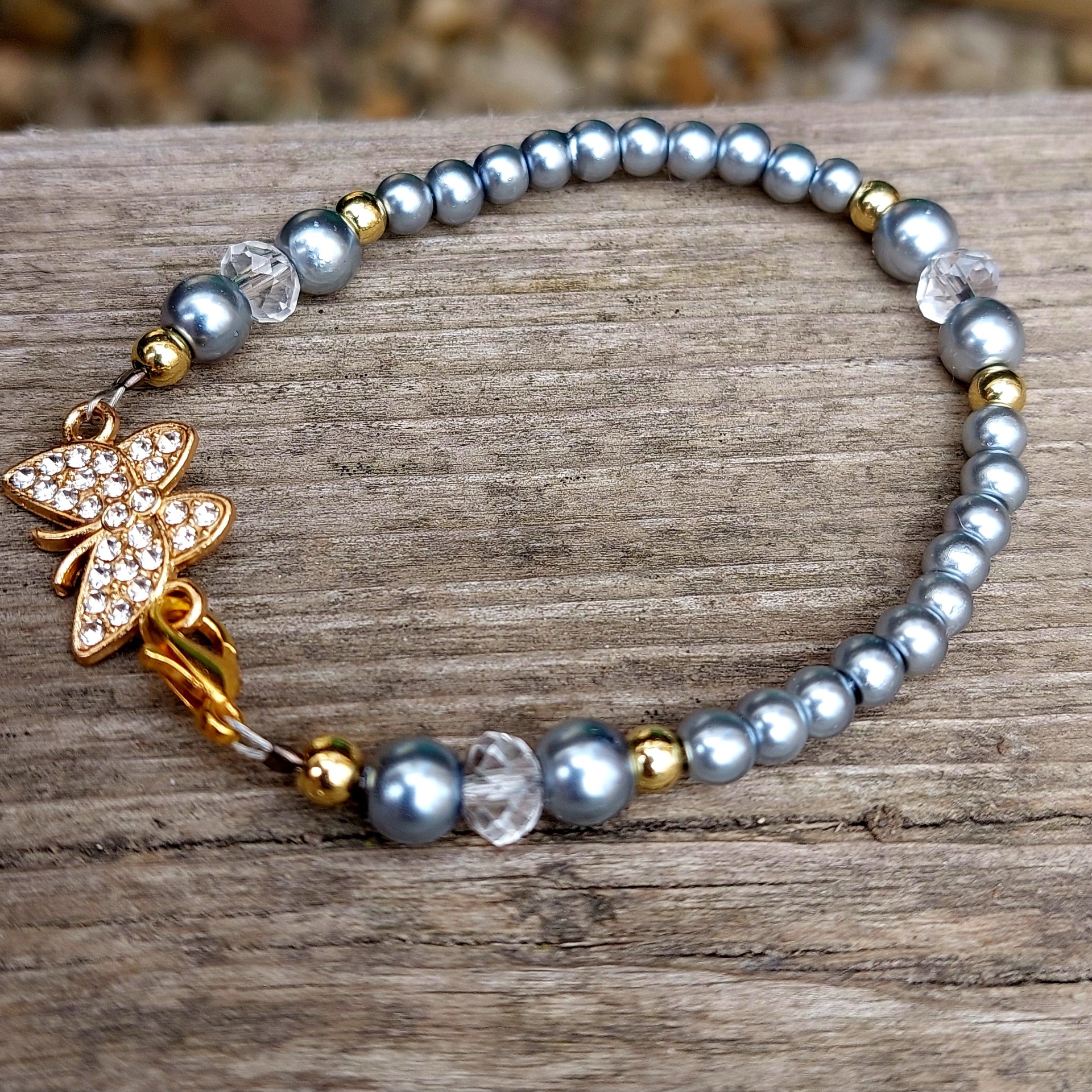 Dominantou šperku je zlatý motýlek zdobený drobnými šatonovými kamínky (krystaly), které se při každém pohybu jemně třpytí a dodávají náramku sofistikovaný vzhled. Náramek je vytvořen z tmavě šedých voskovaných perliček o velikosti 4 mm a 6 mm, doplněných zlatými kuličkami a třpytivými křišťály.