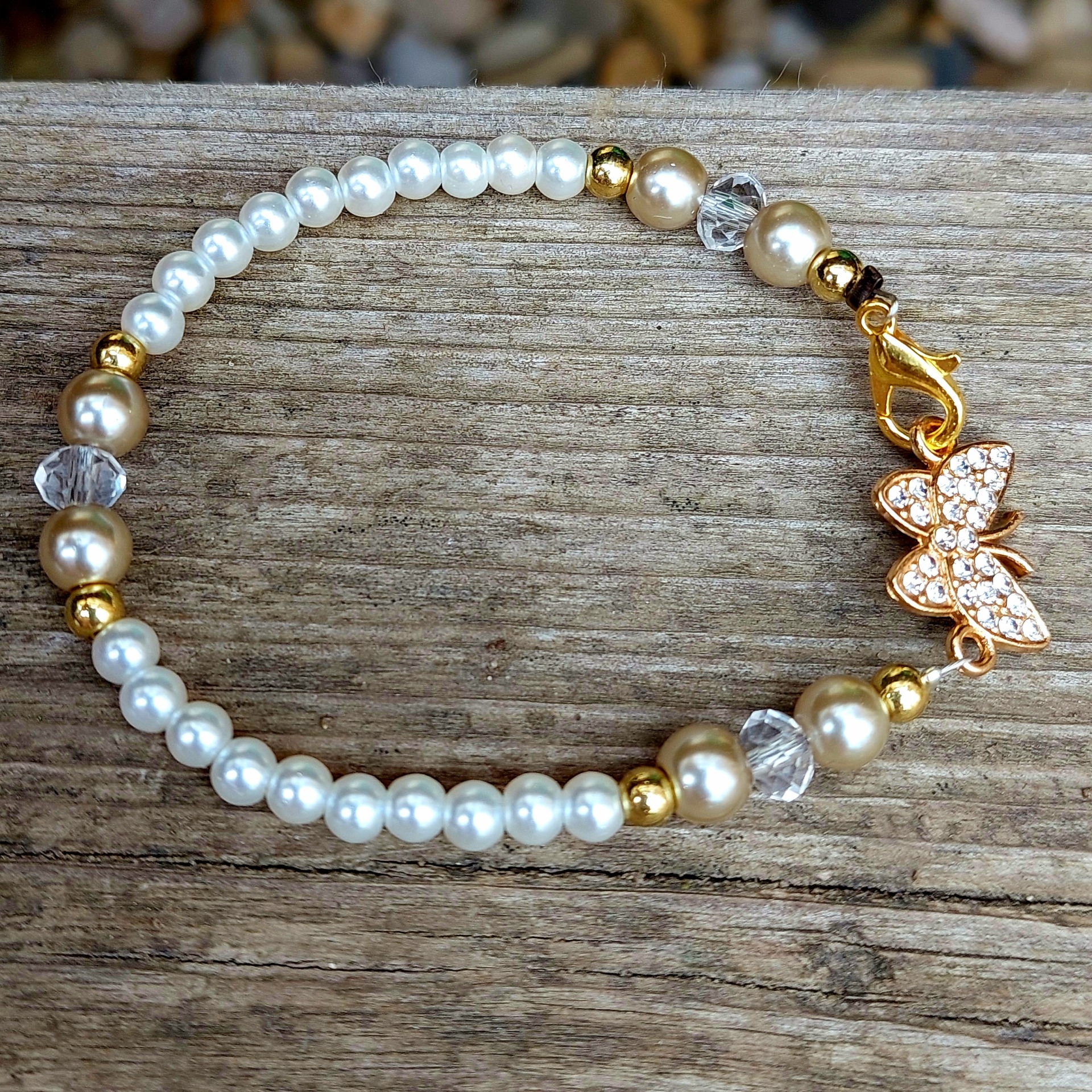 The centerpiece of the piece is a gold-toned butterfly adorned with tiny chaton stones (crystals) that gently sparkle with every movement, giving the bracelet a refined and sophisticated look. The bracelet is made of 4 mm and 6 mm waxed pearls, complemented by gold beads and shimmering crystals.