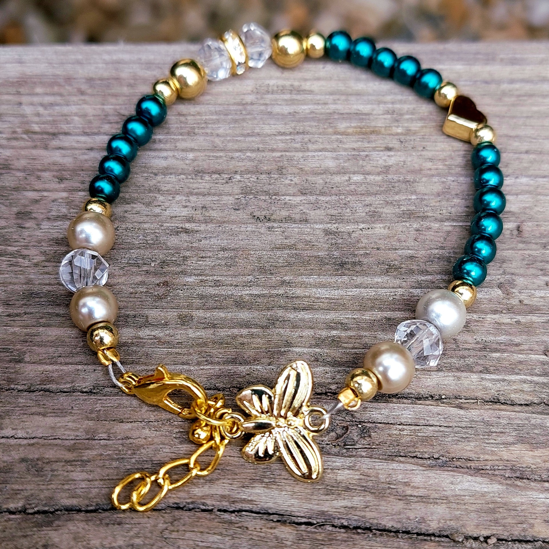 The centerpiece of the piece is a gold-toned butterfly. The bracelet is made of 4 mm and 6 mm waxed pearls, complemented by gold beads and shimmering crystals.
