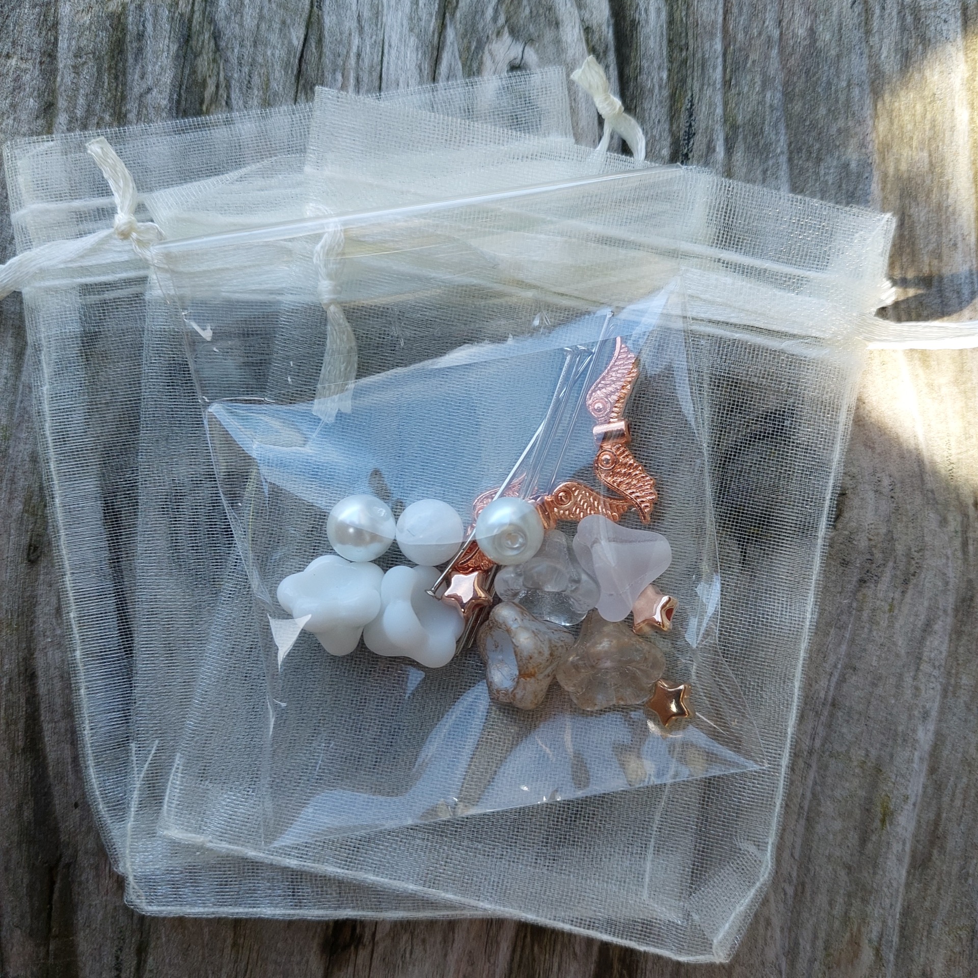 zlatem v kombinaci bílé, matné a krystalové, kovový nýtek, rose gold křídla s hvězdičkou a dárkové sáčky z organzy. Na zakončení doporučujeme kulaté ketlovací kleště.