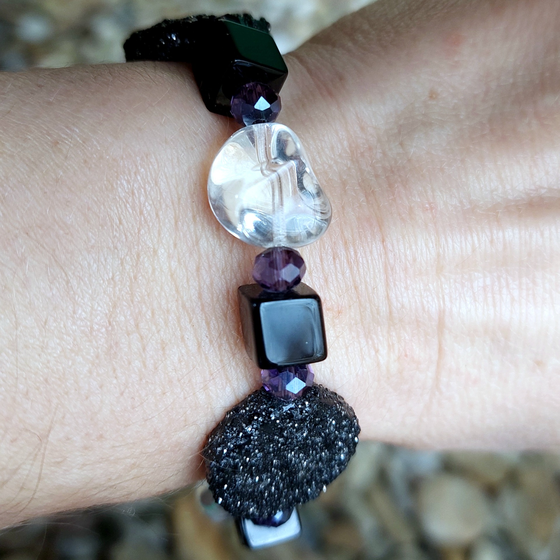 Design tvoří černé ploché kolečko se zdrsněným povrchem, hladká černá krychle a průhledná mačkaná oliva. Mezi nimi jsou vsazeny drobnější broušené rondelky v jemně fialovém odstínu, které dodávají náramku decentní třpyt a zajímavý kontrast.