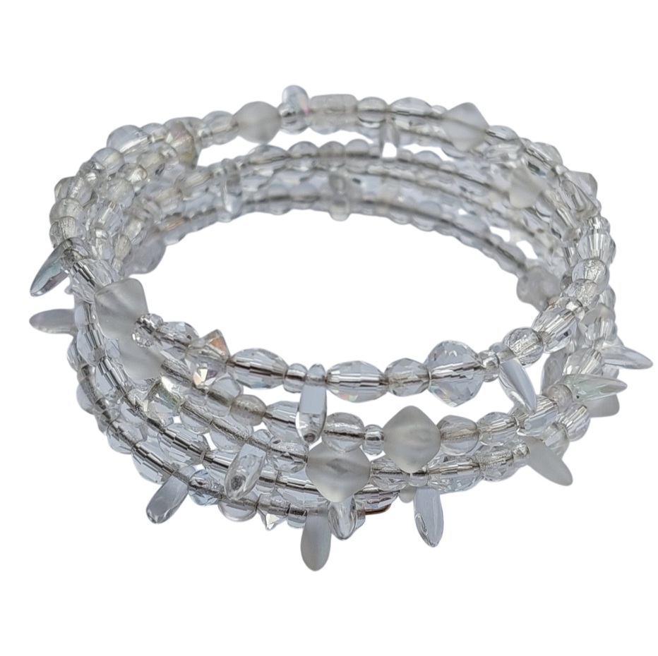 Módní dámský náramek vyrobený ze skleněných korálků, navlečených na paměťovém drátku. Předností je snadné navléknutí na zápěstí a pohodlné sundání náramku, který je bez zapínání.  Drátek má 3-4 otočky, směs drobných broušených a rokajlových korálků vytváří široký a bohatý dekor.