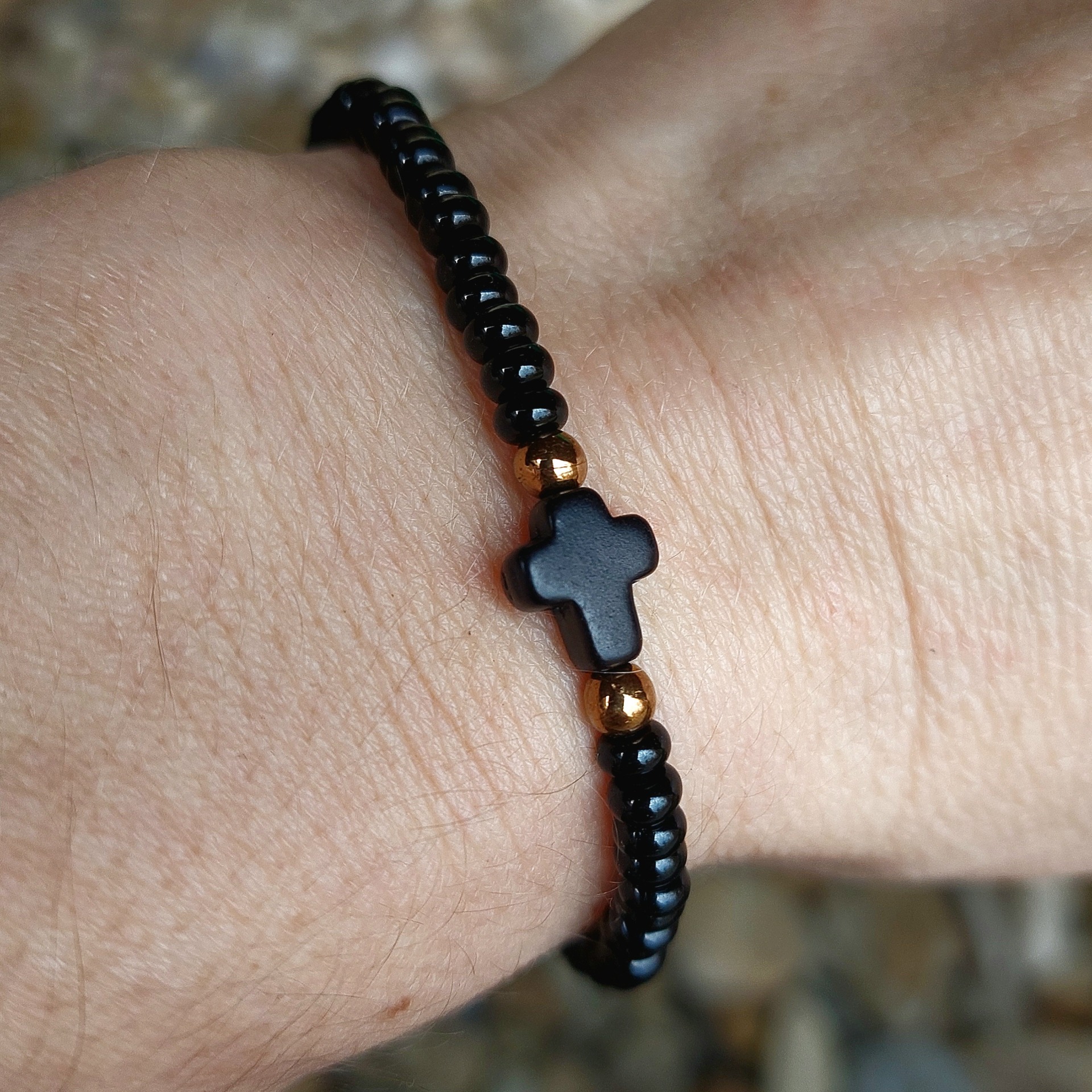 Náramek je tvořen kvalitními černými rokajlovými perličkami o velikosti 6 mm od značky Preciosa. Dominantou je centrální motiv – černý křížek o velikosti cca 1 cm, který je z každé strany doplněn drobnou bronzovou kuličkou. Tyto detaily vytvářejí zajímavý kontrast a podtrhují celkovou eleganci šperku.