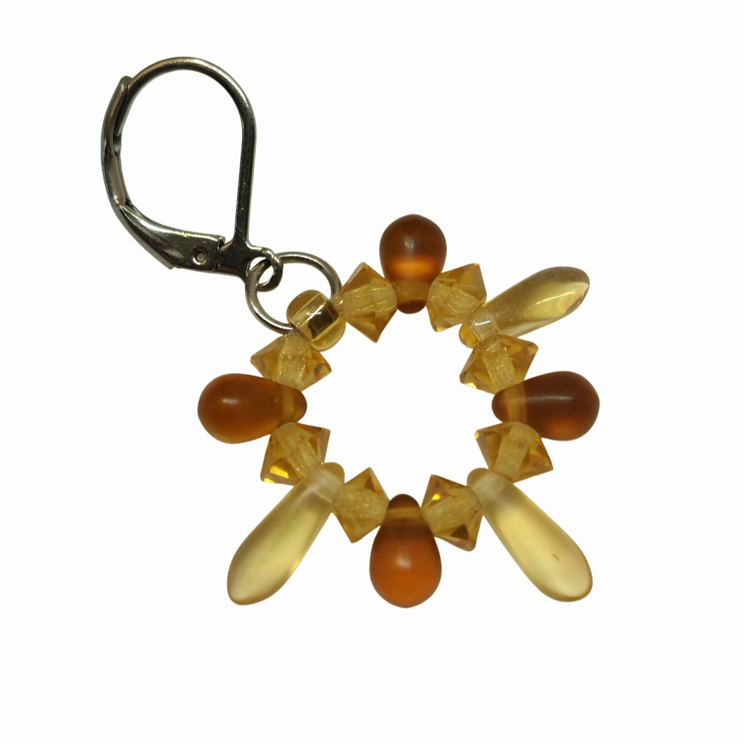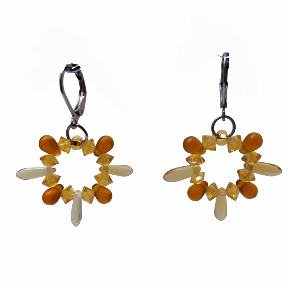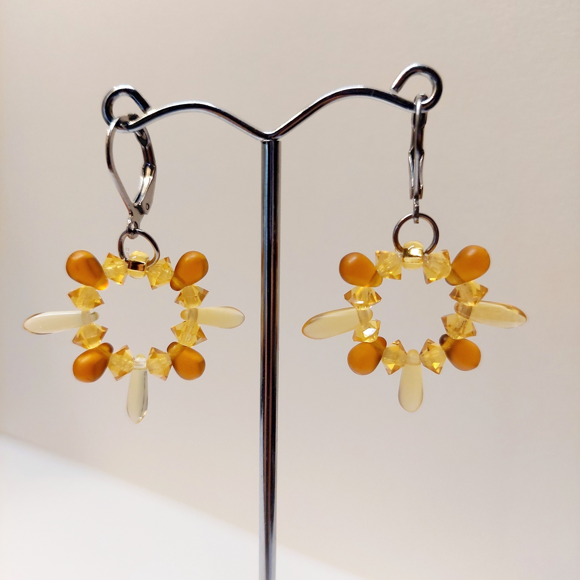 Náušnice mají tvar kruhu o průměru do 3 cm, takže působí elegantně a zároveň nejsou příliš výrazné. Korálky jsou navlečeny tak, že jemně vystupují do stran a vytvářejí zajímavý "paprskovitý" efekt, který krásně zachytává světlo.