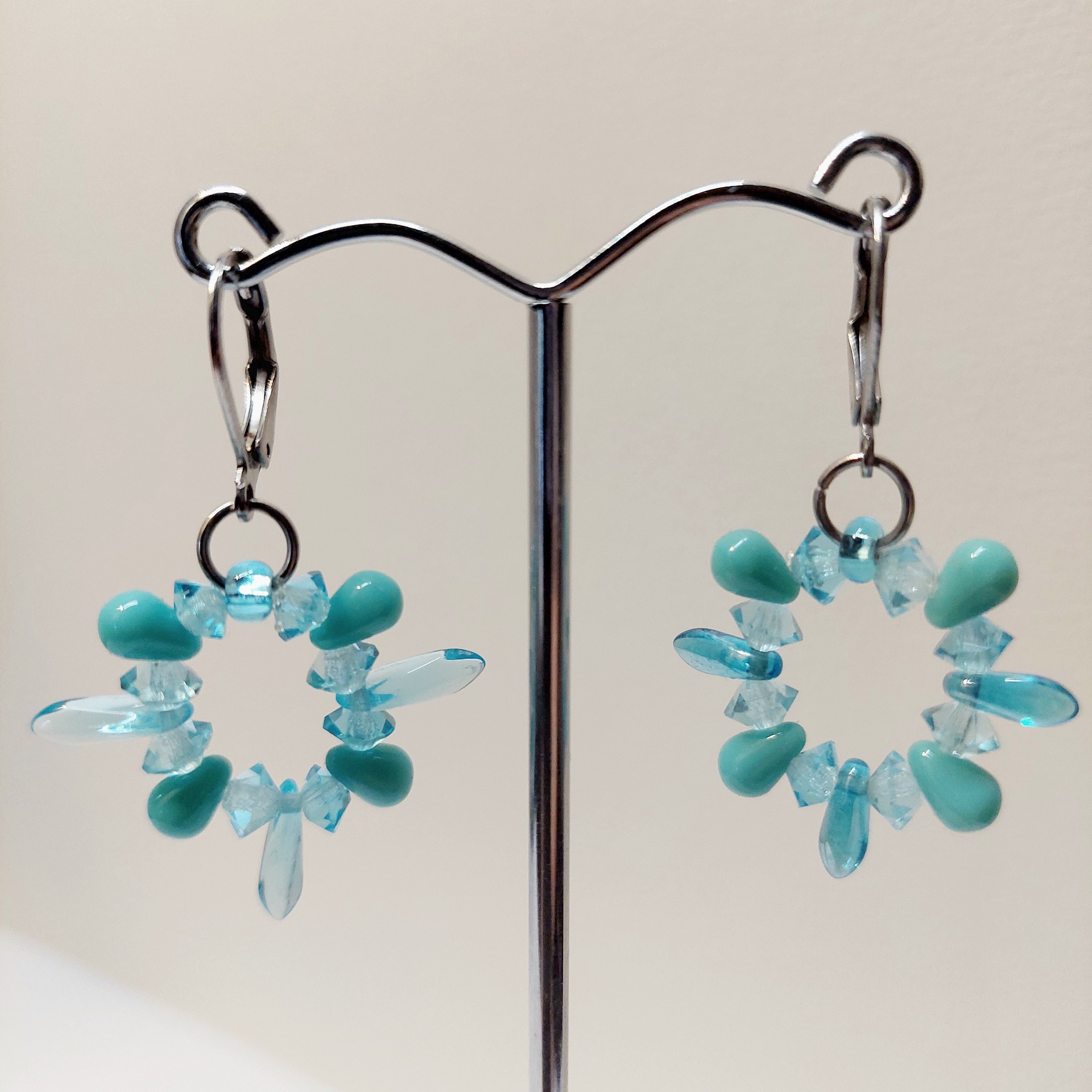Náušnice mají tvar kruhu o průměru do 3 cm, takže působí elegantně a zároveň nejsou příliš výrazné. Korálky jsou navlečeny tak, že jemně vystupují do stran a vytvářejí zajímavý "paprskovitý" efekt, který krásně zachytává světlo.