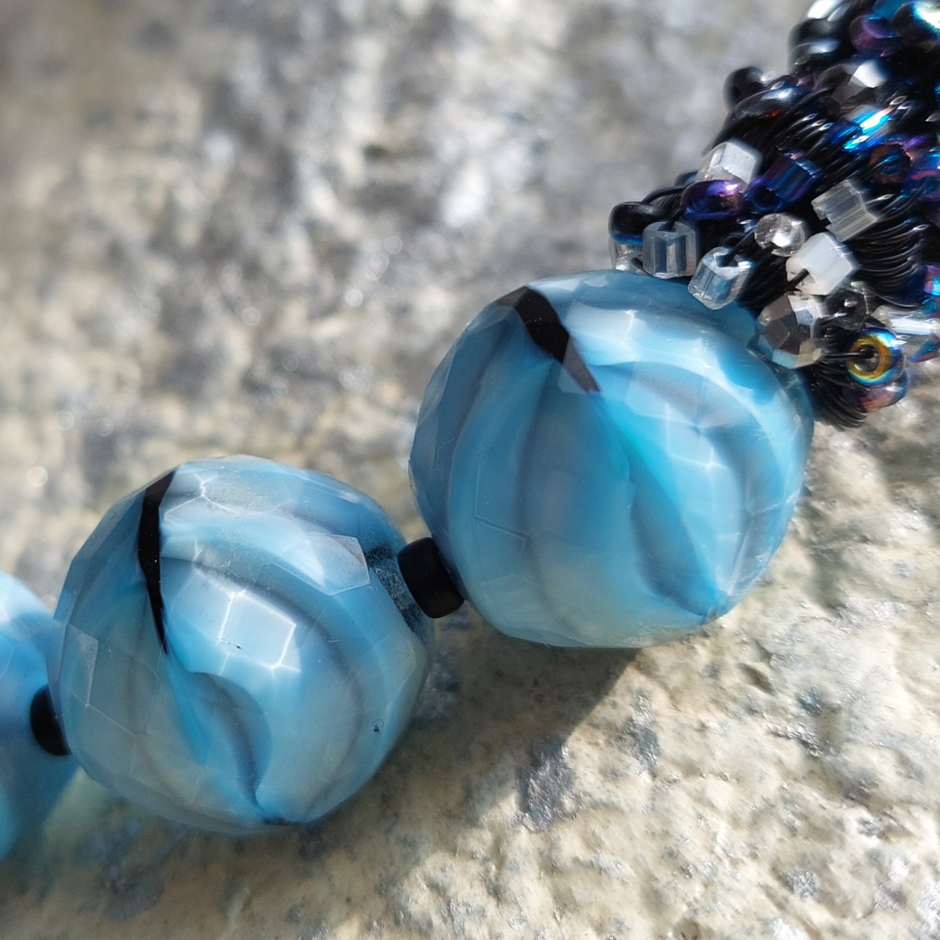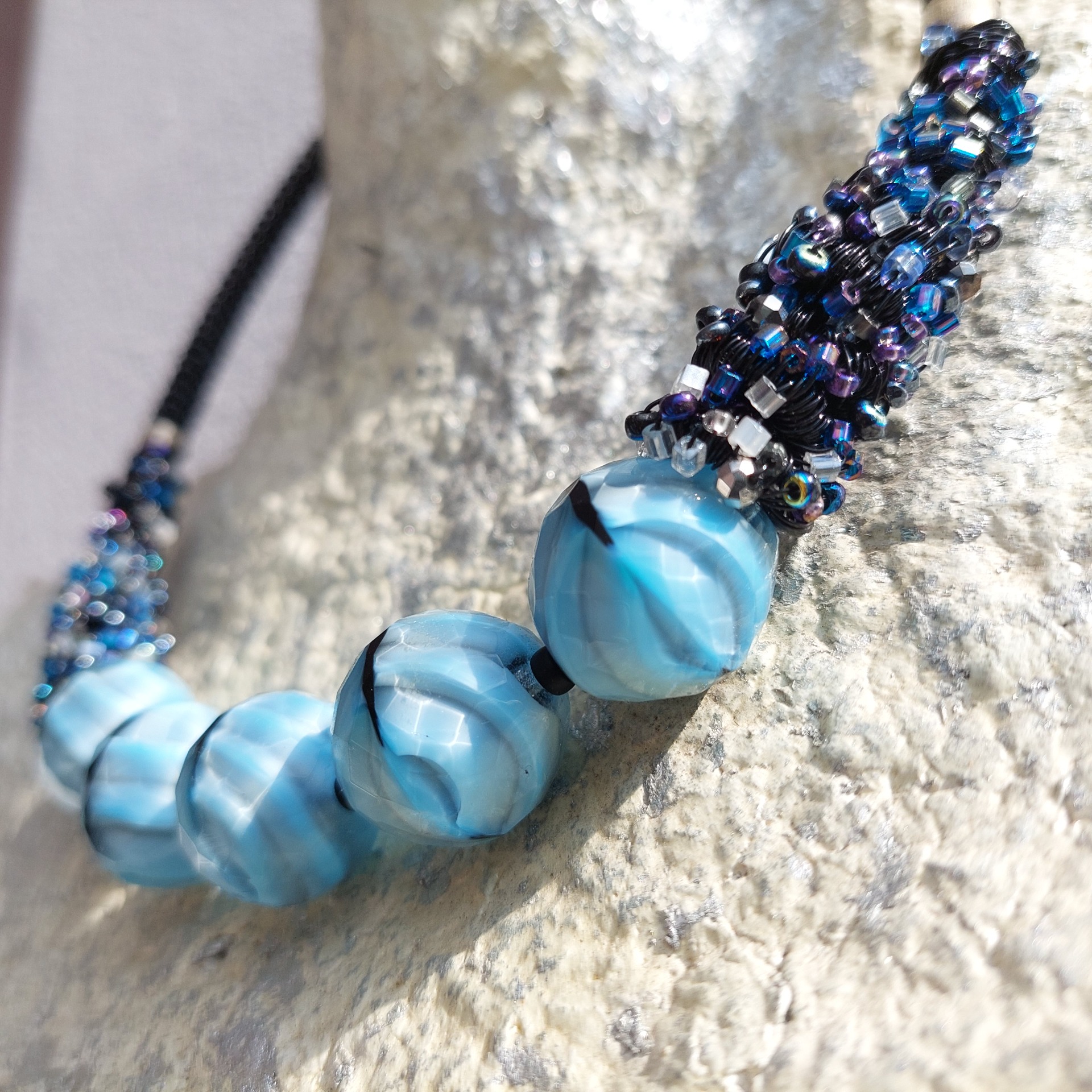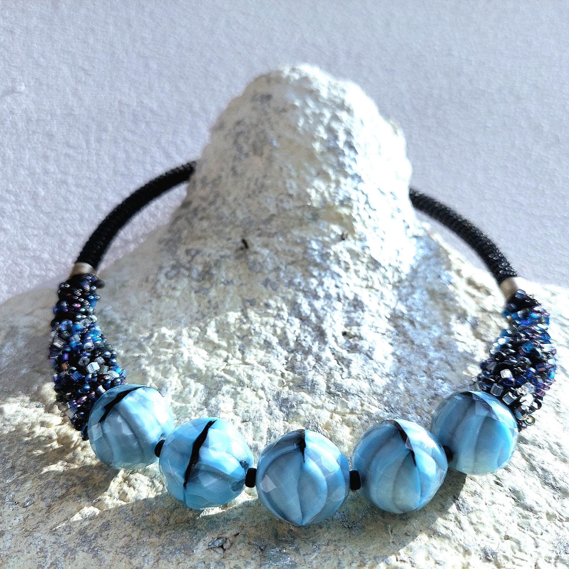 The centerpiece of the necklace is a set of five lrge glass auqa blue, faceted beads (20 mm in size) arranged symmetrically from the center into a balanced composition. The neckline is bordered by a black, hand-coiled wire twisted into a delicate spiral – a technical detail that adds both structural strength and aesthetic rhythm to the piece. This is softened by tiny iris-colored seed beads wrapped in dark wire. An ideal accessory for a festive party or any other special occasion.