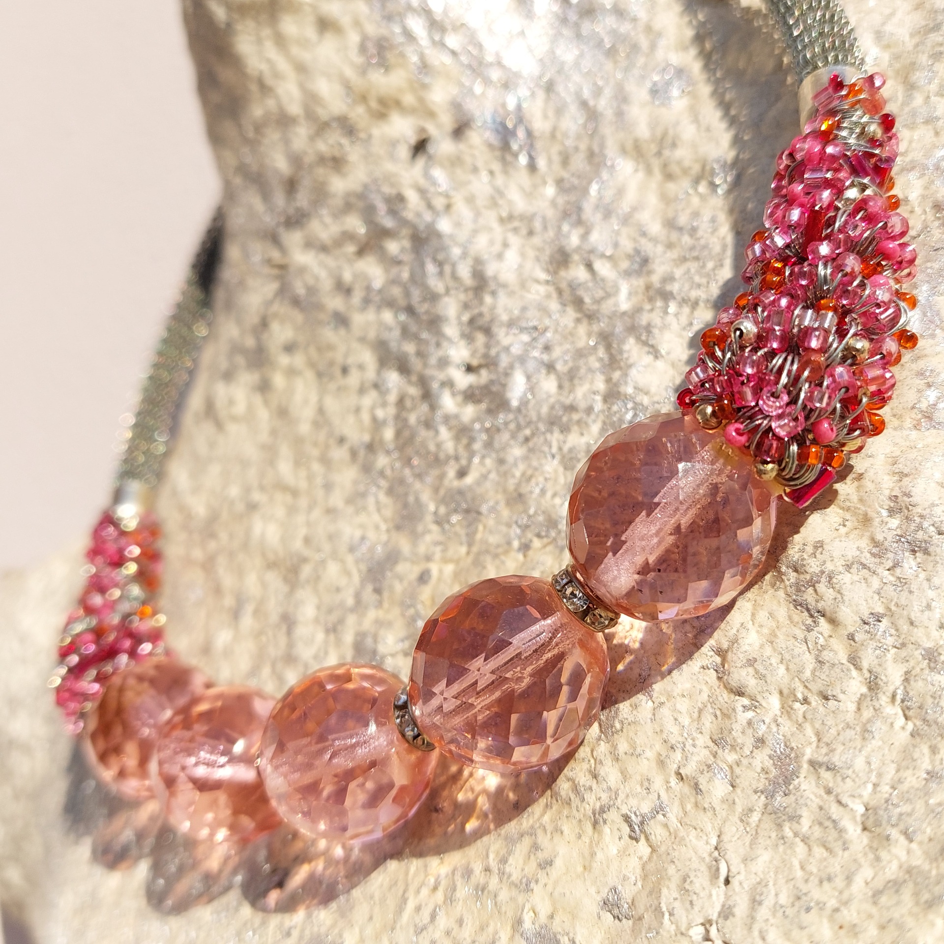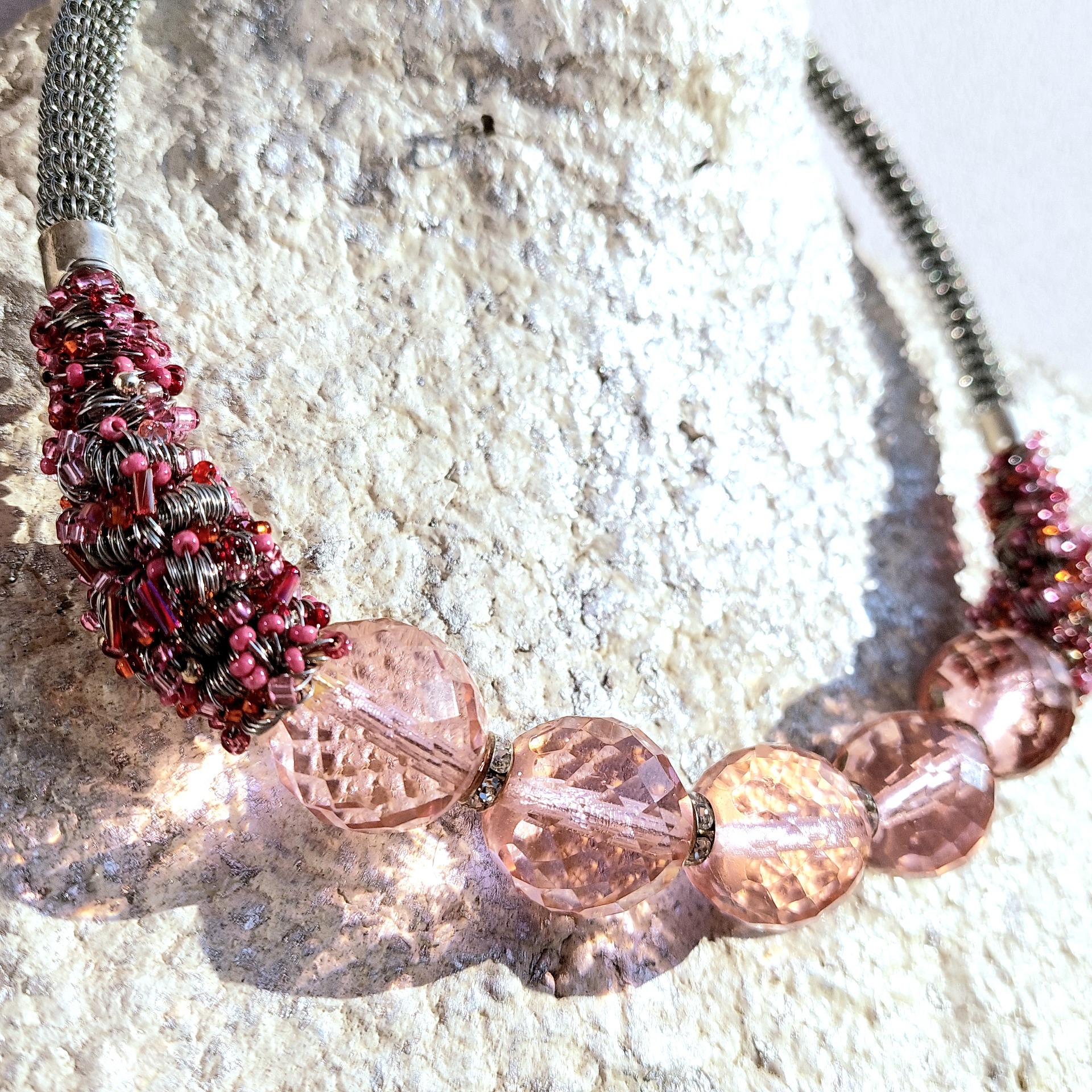 Encircling the neck is a silver hand-coiled wire shaped into a fine spiral – a technical detail that lends the piece both strength and rhythmic elegance. This is gently softened by tiny pink seed beads, seamlessly wrapped into the wire.
