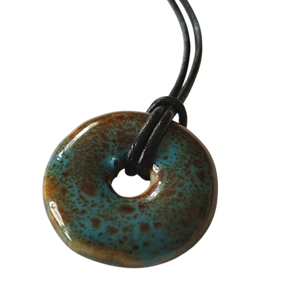 Ceramic Pendant on Leather Cord – Brown & Blue Glossy Rondelle (Ø 2.58 cm)