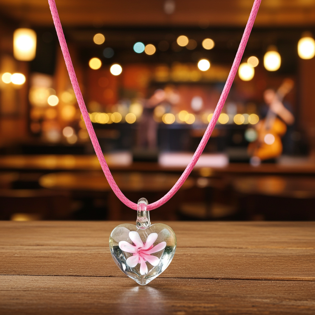 Skleněný přívěsek je navlečený na barevné šňůrce se zapínáním, která ladí s barvou srdíčka. Díky ruční výrobě je každý kus trochu jiný – drobné tvarové odchylky jsou přirozenou součástí kouzla tohoto šperku. Stejně tak i barevnost a tvar kytičky uprostřed skleněného srdíčka se může lišit.